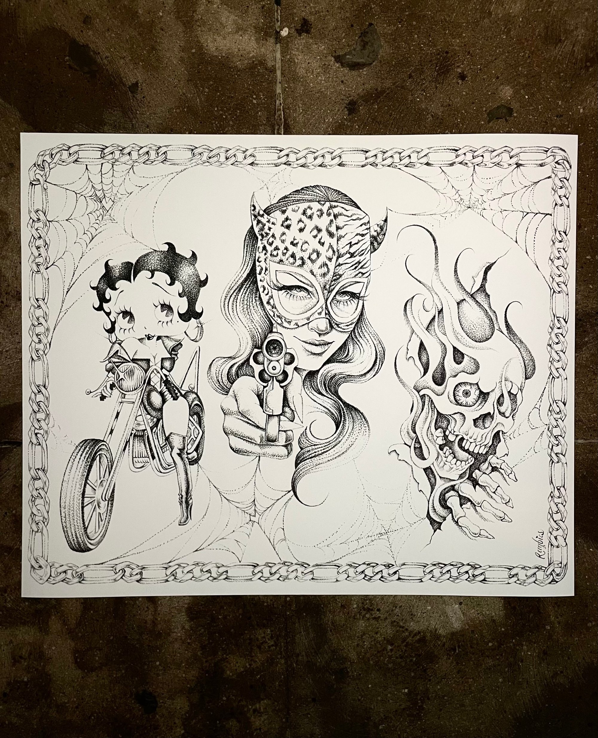 My take on classic 80s American trad / Chicano style tattoo art featuring Betty boop, a criminal femme fatale, and a flaming skull ripping out of the page.